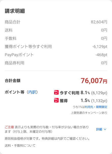 手持ちのポイントを使って 76,007 円と、価格.com 掲載情報の最安値よりも安く買えたので大満足。