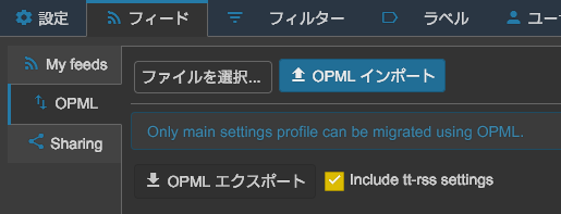 "Include tt-rss settings" にチェックを入れておけば TTRSS の設定も込みで全部バックアップ取ってくれるのでエクスポートしておく。