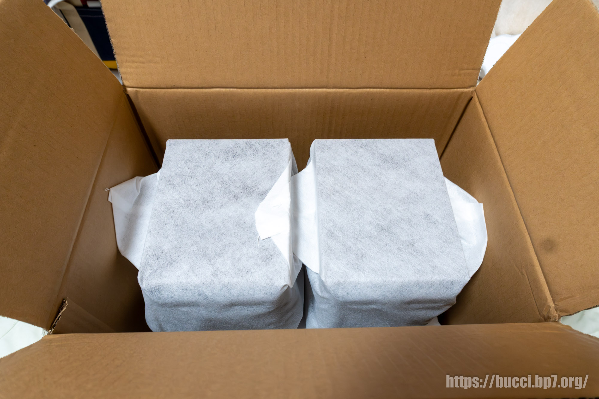 発泡スチロールをどかすと DALI SPEKTOR1 本体が見えてくる。白い布の袋に個装されているのがリッチ感あって良き。