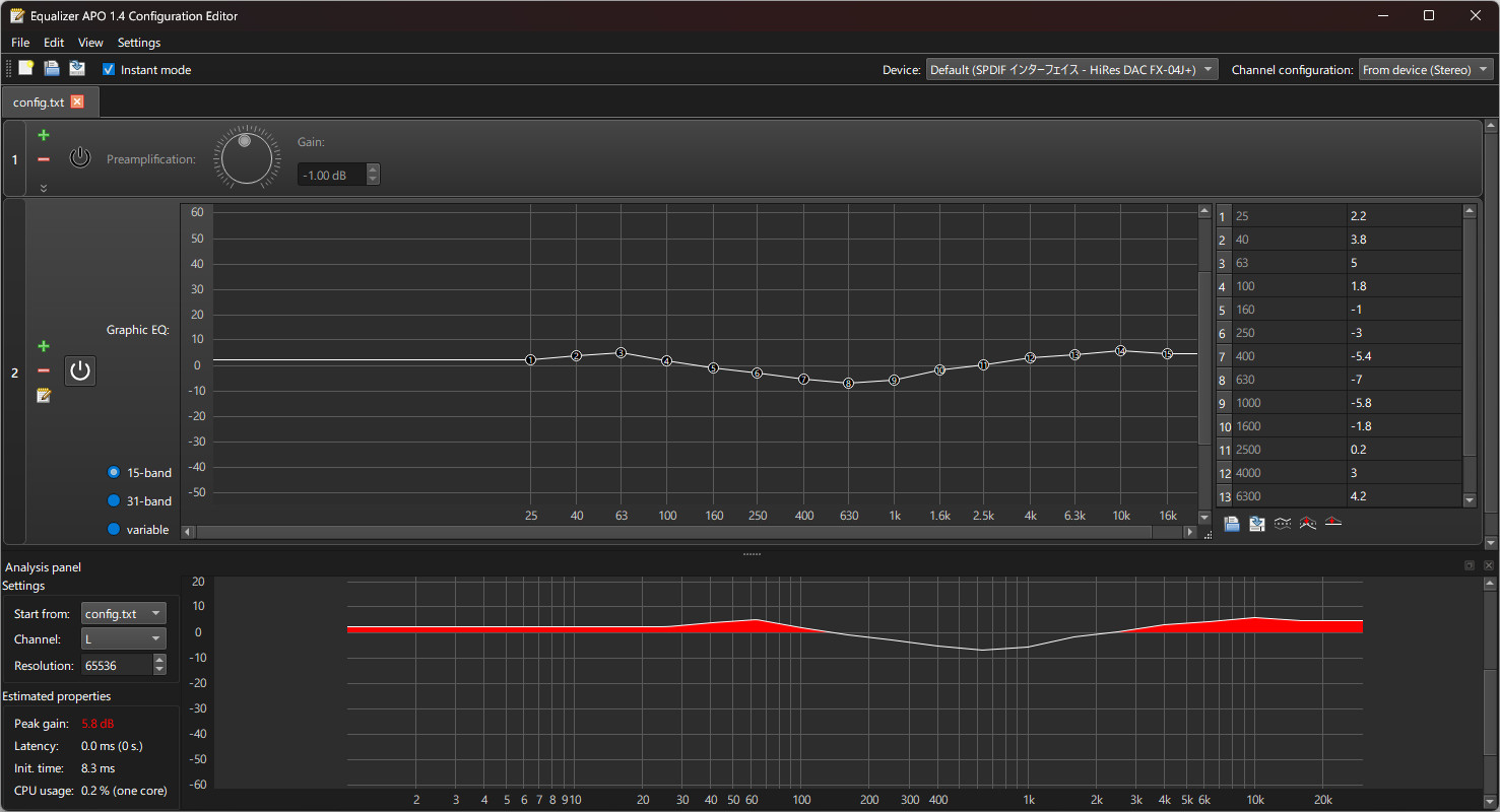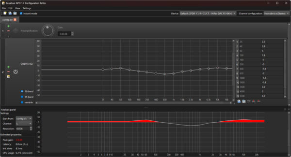 今のところは Equalizer APO で次のような調整になっている。