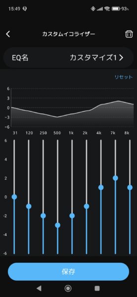 デフォルトのチューニングでは、やや中音域が前に出ていたので、Android 版 PeatsAudio アプリで自分好みな音へ以下の通り調整した。