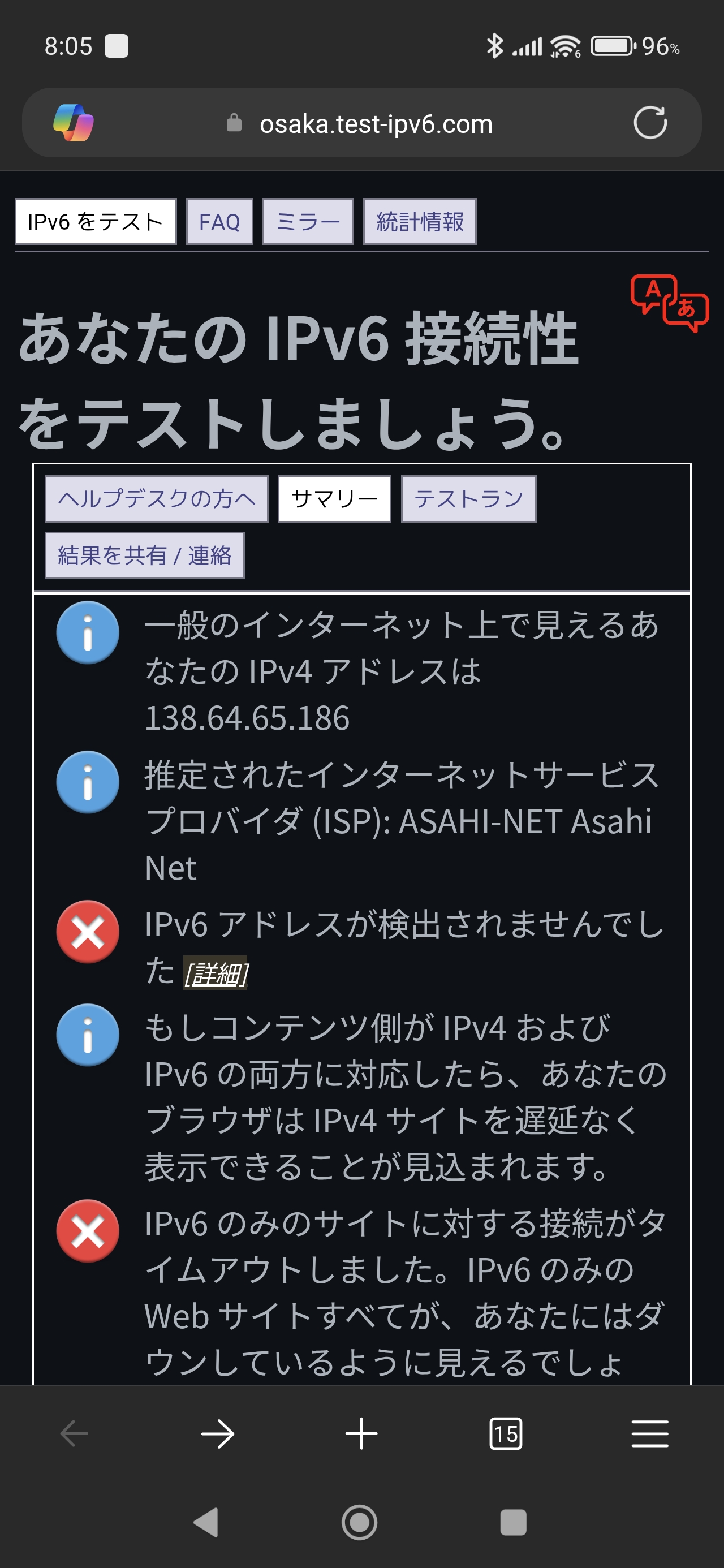 外部の IPv6 テストサイトを開いたらまぁ例の如くパケ詰まりの症状が出ていた。