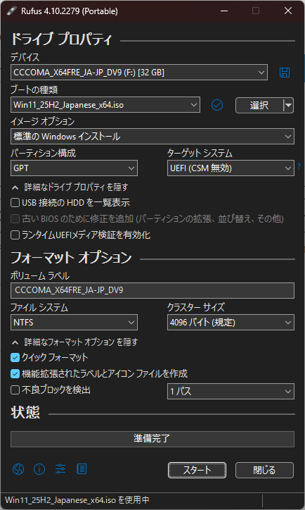 Rufus を起動し、ダウンロードしておいた ISO ファイルを指定。あとはスタートをポチッとして――