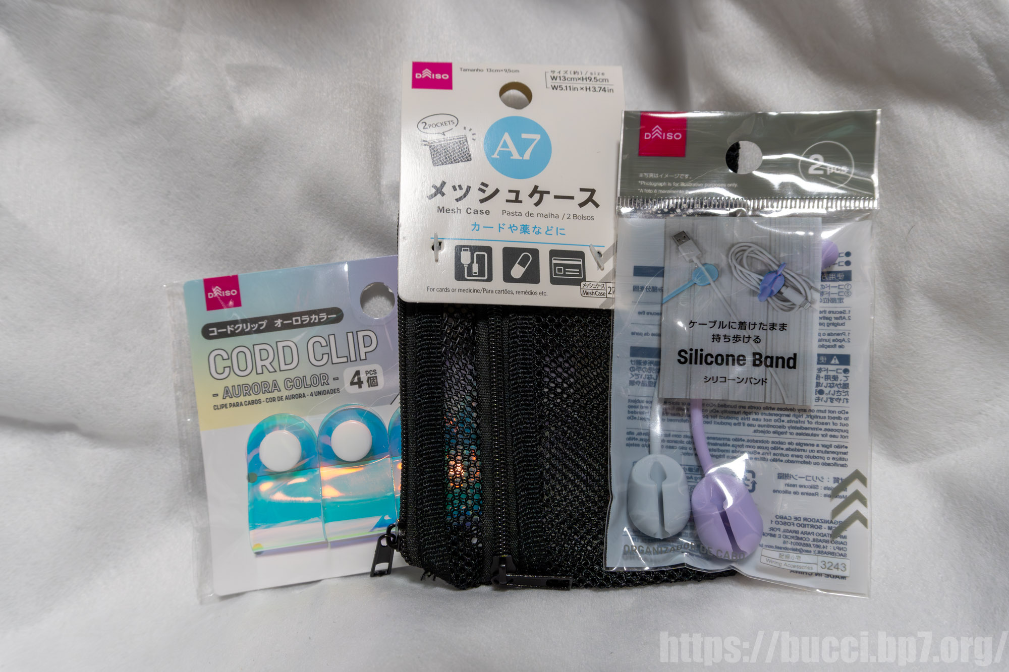 コードクリップとシリコンバンド、A7 サイズのメッシュケースが候補として上がったので購入。