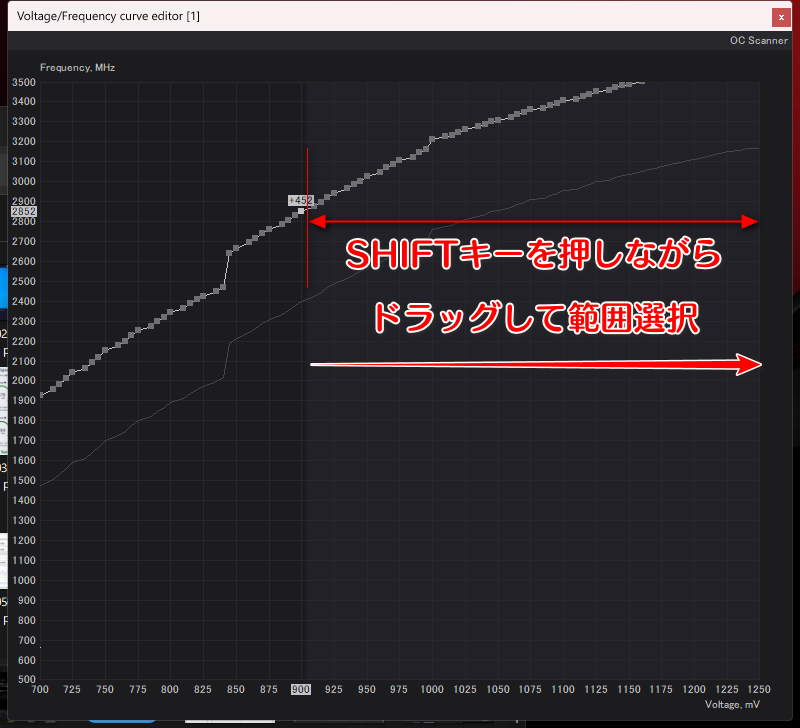 上で動かした点のひとつ右から右端の点まですべて含まれるよう、SHIFT キーを押しながらドラッグして範囲選択をしておく。