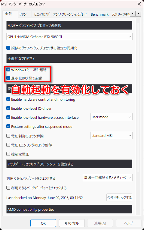 後処理として Afterburner が Windows 起動時に最小化した状態で自動起動するように設定しておく。