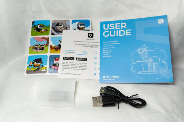 イヤーピース、充電ケーブル、USER GUIDE、ピーツくんステッカー、PeatsAudio に関する紙。