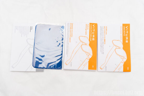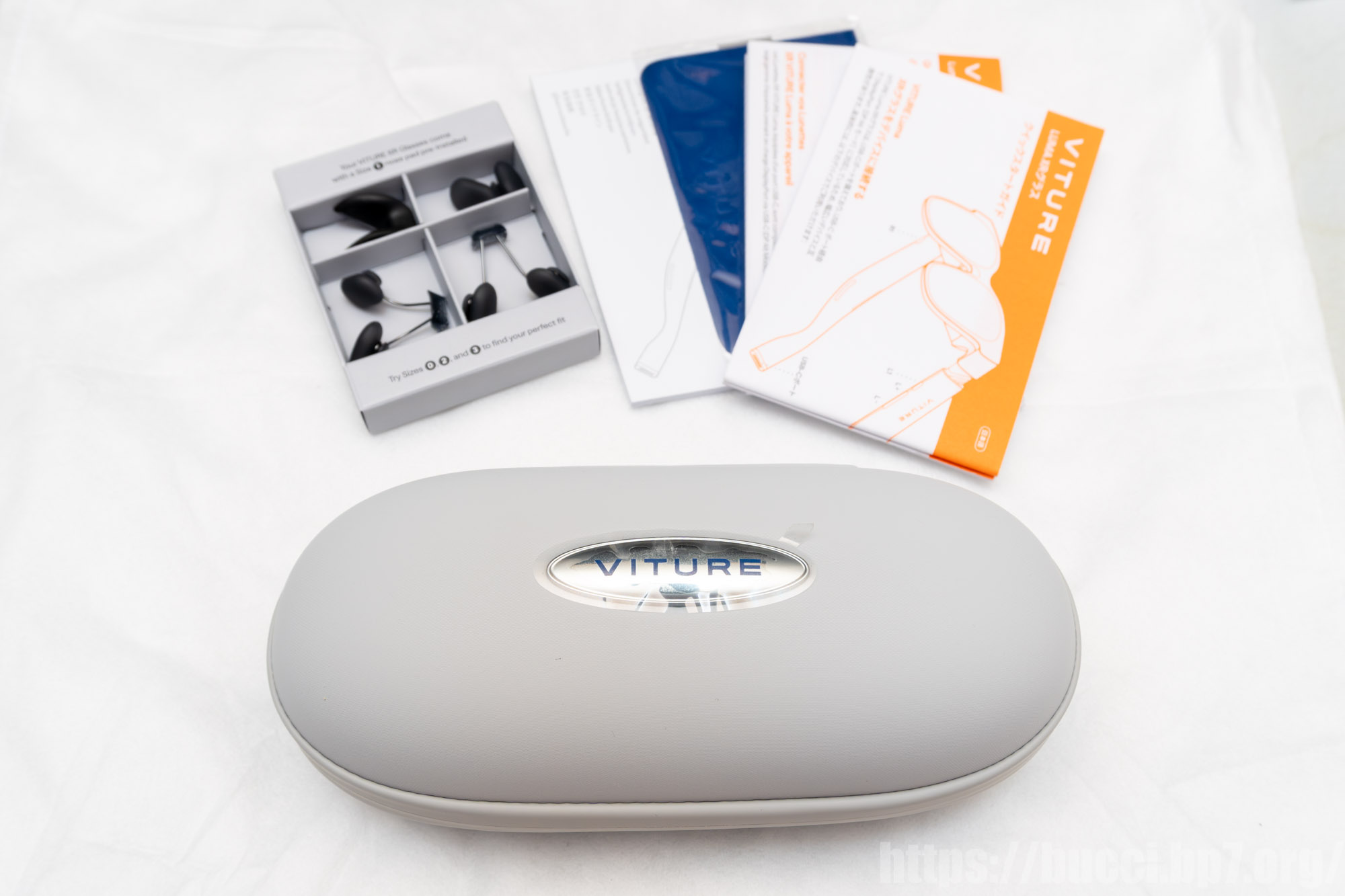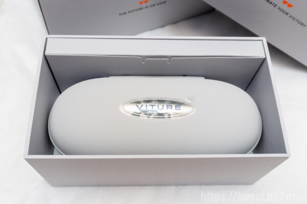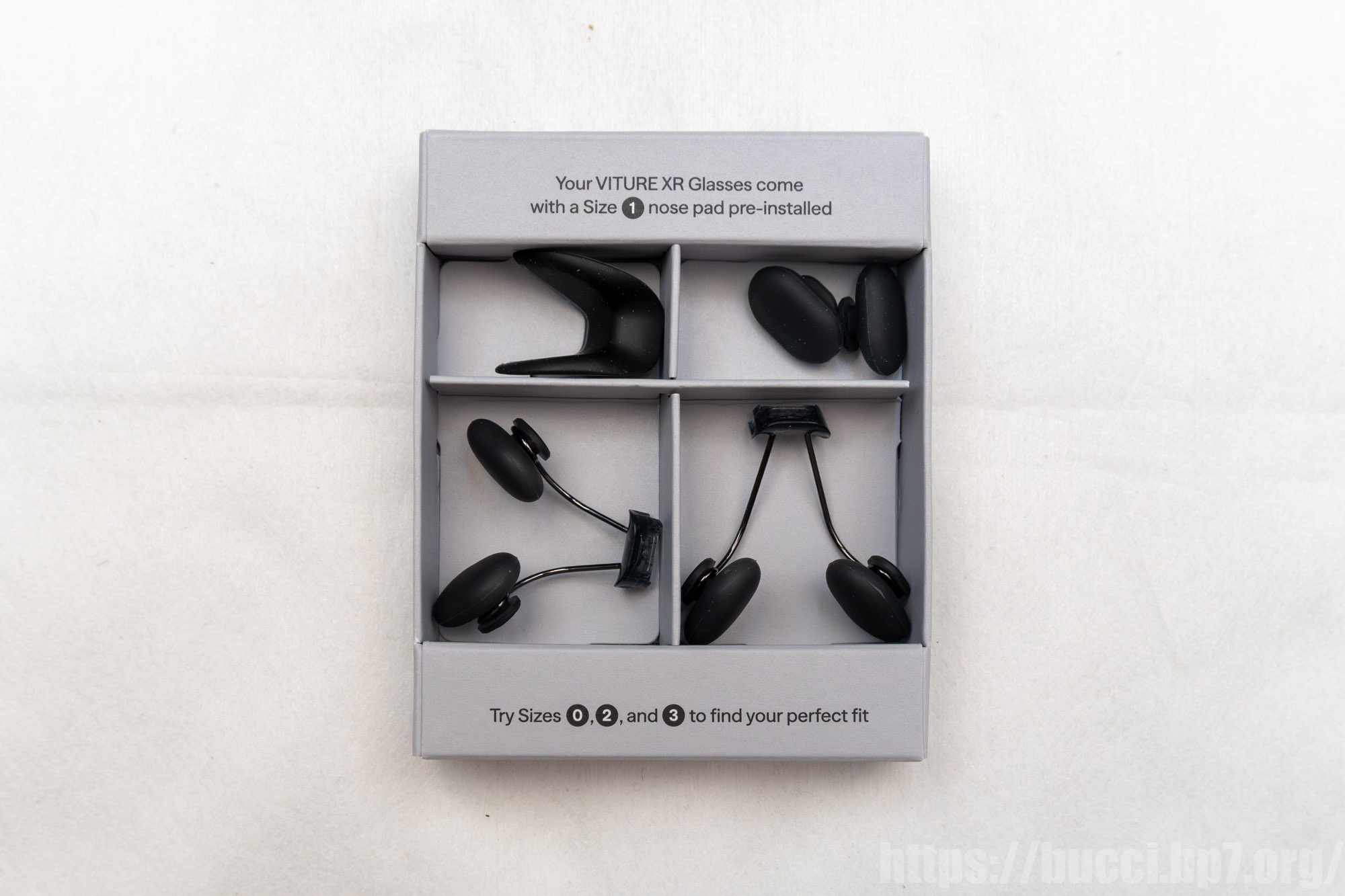 VITURE Luma が収められたケースとノーズパッドとマニュアル類の入った箱が見える。