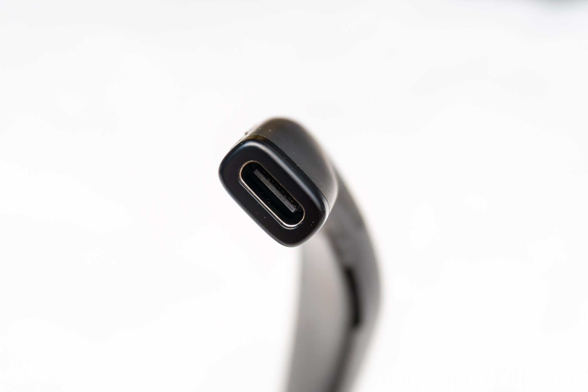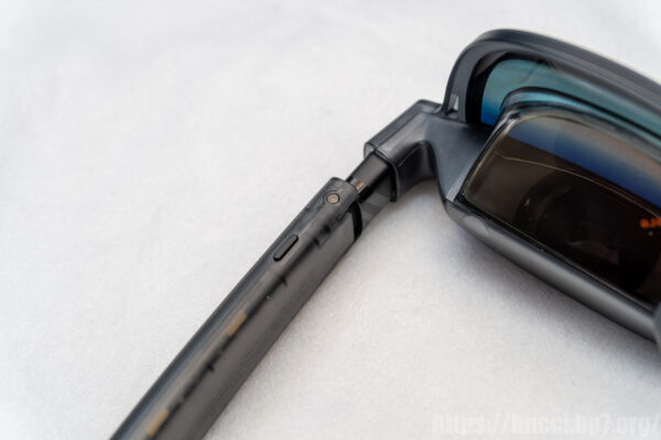 右のテンプルに USB Type-C 端子がある。付属のケーブルは個々に接続しよう。
